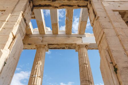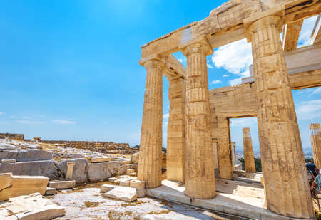 Ancient Greek ruins on Acropolis, Athens, Greece. Remains of Propylaea Palace on blue sky background in Athens city center. Concept of past civilization, old temple, history and travel in Athens.