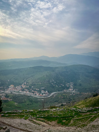 Aerial view of Pergamon Acropolis ruins on mountain in Bergama Turkey