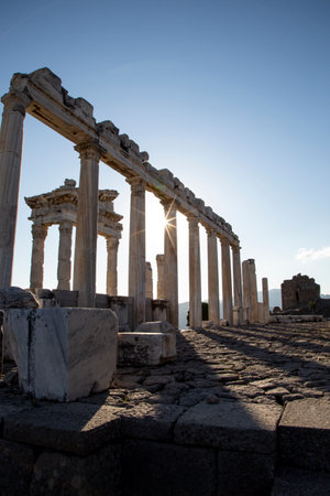 Travel concept photo. Trajan Temple columns in ancient city of Pergamon, Turkey