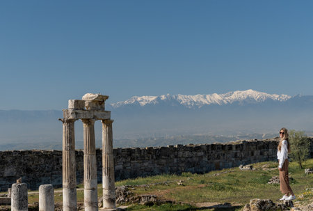 Woman at Roman ruins with snow-capped mountain peaks in the background
