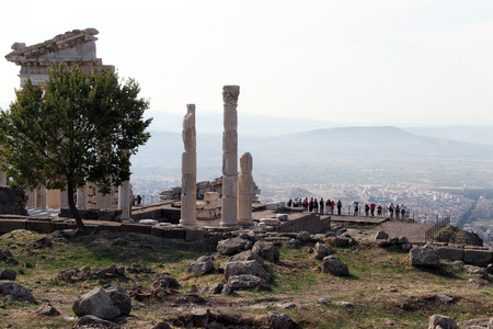 Ruins of Trajan temple and tourists in Pergam, Turkey