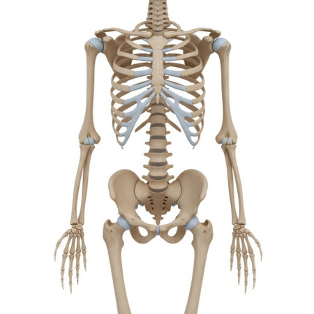 This image depicts the detailed anatomy of the human skeletal system, showcasing the arrangement of bones in the body. The skeleton includes the skull, spine, rib cage, pelvis, and limbs, highlighting the structure and alignment of the bones. This anatomical representation is useful for educational purposes, particularly in medical or biological studies.