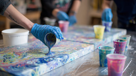 Individual wearing blue gloves pours vibrant paint onto a canvas at an art workshop, with several cups of paint arranged on the table