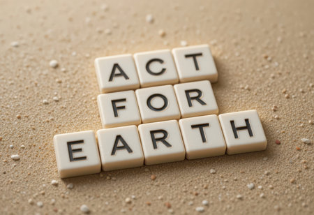An inspiring message spelled out in letters on sandy ground, promoting environmental awareness and urging action to protect our planet for future generations.