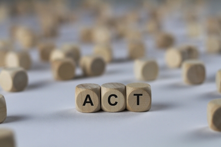 Act or act symbol. Turned wooden cubes and changed the word 'act' to 'act'. Beautiful green background, copy space. Business concept.