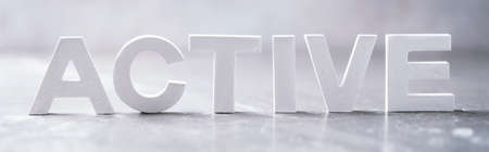 Word ACTIVE made with cement letters on grey marble background. Copy space. Business concept