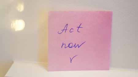 Pink sticky note displaying the handwritten text Act now placed on a white surface