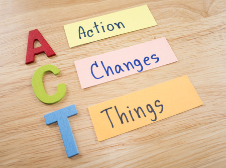 Wooden alphabets building the word ACT - Action Changes Things acronym on blackboard