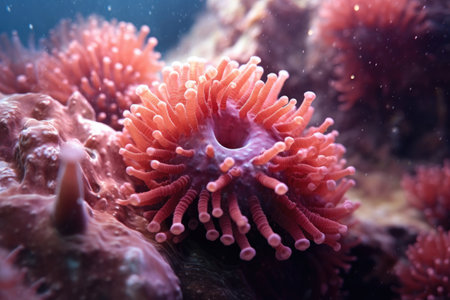 close-up of coral polyps with extended tentacles capturing prey, created with generative ai