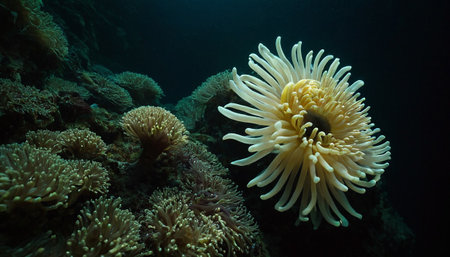 close-up of coral polyps capturing plankton in the dark, created with generative ai