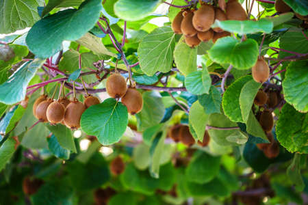 Fresh kiwi fruit on a growing tree. The kiwi harvest season.