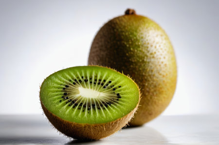 A fresh kiwi sliced in half, showing the bright green flesh and black seeds, placed on a white background