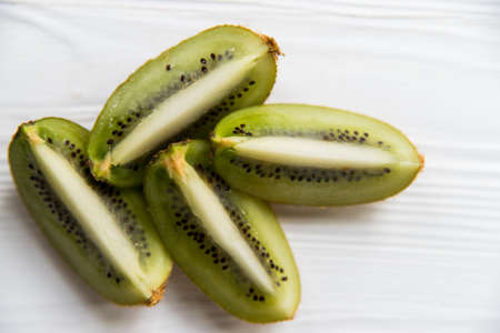 Kiwifruit sliced in four parts on a white surface background