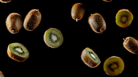 Various kiwis float elegantly, highlighting their fuzzy brown exterior and bright green flesh. The contrast against the dark background emphasizes their shapes and details.