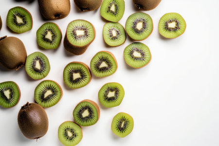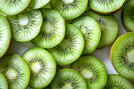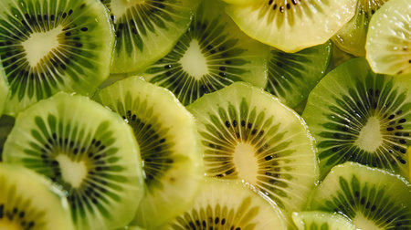 Freshly sliced kiwi fruit pieces arranged in a visually appealing pattern. the vibrant green flesh, delicate seeds, and contrasting textures make it perfect for themes related to healthy eating, summer refreshment, and natural beauty. Generative AI