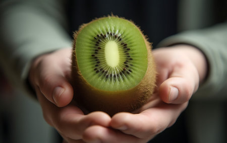 Freshly cut kiwi shows vibrant green inside, inviting summers sweetness to delight.