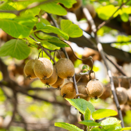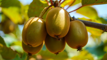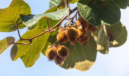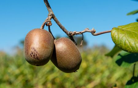 Kiwi tree branch with ripe fruit in close-up
