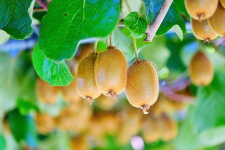 New harvest of golden or green kiwi, hairy fruits hanging on kiwi tree in orchard in Italy
