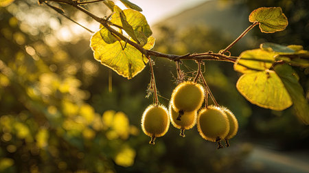 A cluster of ripe, fuzzy kiwifruit hangs from a branch, bathed in warm sunlight with blurred green foliage in the background.