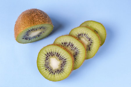 Delicious kiwi slices on a blue background. The concept of nutrition for the treatment of sleep and insomnia. Background with copy space