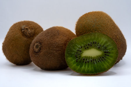 Whole ripe kiwi fruits with one sliced piece revealing the fresh green inside. Great for healthy lifestyle visuals, nutrition themes, organic food and supermarket advertising.