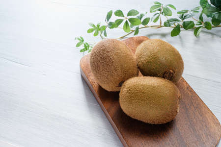 Kiwi fruits and cutting board on wooden table