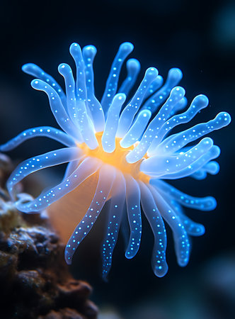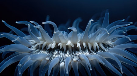 An image showcases a sea anemone in a close-up view against a dark backdrop. The aquatic plant is characterized by a translucent, radial arrangement of tentacles, exhibiting a range of blue and white hues. The composition may be suitable for scientific illustrations, educational resources, or artistic designs.
