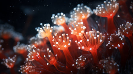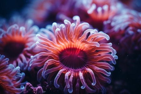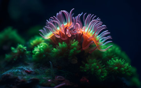 close-up of vibrant bioluminescent deep sea coral, created with generative ai