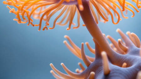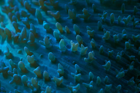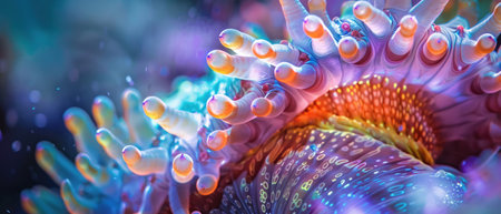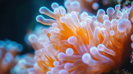 A macro of vibrant coral polyps opening like flowers on ocean floor, glowing, underwater, closeup, soft focus