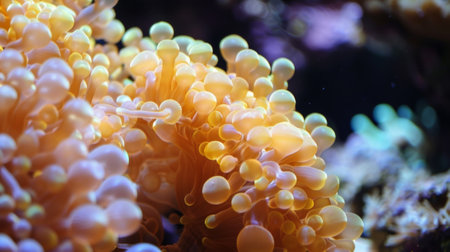 A close-up shot of bubble anemones, their translucent tentacles reflecting the light, providing a stunning visual contrast on a coral reef