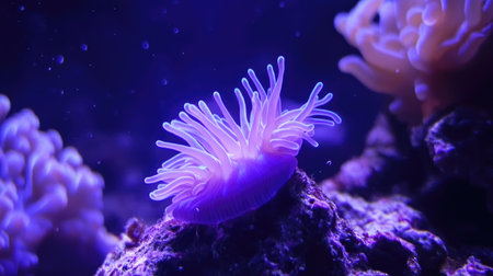 A stunning purple sea anemone rests gracefully on a vibrant coral reef, showcasing its delicate tentacles and soft illumination. This serene underwater scene highlights the beauty of marine life.
