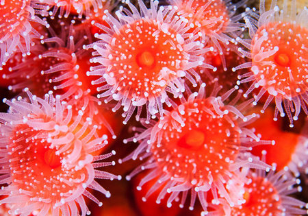 Bright actinia anemones display their vibrant colors and unique textures underwater.