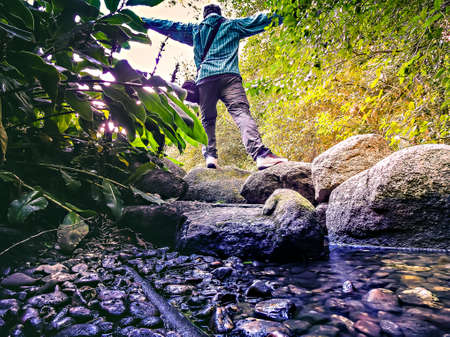Hiker man jumping over the mountain. Freedom, risk, success and challenge. Focus on man