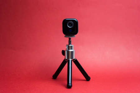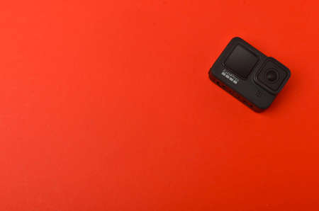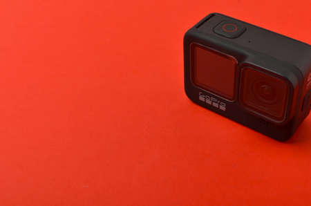Kuala Lumpur, Malaysia - April 30, 2021: New flagship action camera gopro 9 black on red background. Selective focus.