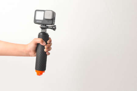 Banner. White action video camera, in the hand of a guy on a black background in the studio