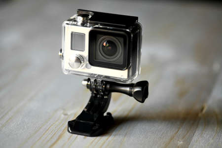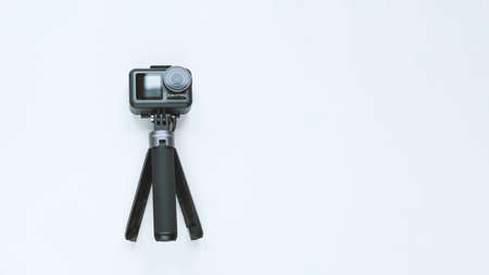 Kharkov, Ukraine - April 6, 2017: GoPro HERO 5 black edition digital action camera on tripod. Compact gadget waterproof , support 4k video, voice controls and is often used in extreme photography