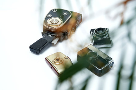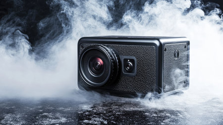 A sleek camera sits elegantly amidst a foggy atmosphere, accentuated by dramatic lighting. This composition emphasizes design, detail, and innovative features.