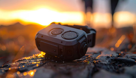 A durable, waterproof remote control rests on a wet, rocky surface, its silhouette framed by the golden light of a dramatic sunset. This image evokes a sense of adventure, resilience, and the end of a successful day of exploration.