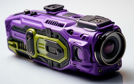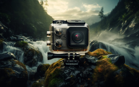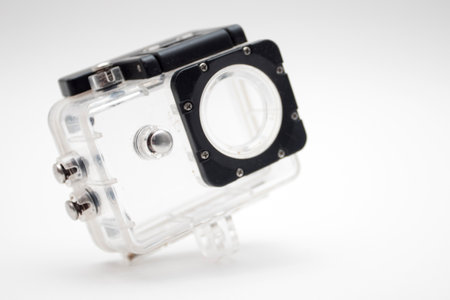 Concept: gear, gadget, action lifestyle, millennial. Vivid colorful shot of action camera in waterproof case splashed with water. Time freeze.