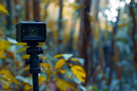MUNICH, GERMANY - Dec 05, 2020: GoPro was mounted on a tree. Winterly autumnal forest in Europe. Action cam in use