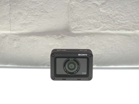 Sony Cuber-shot DSC-RX0 is black and very small, on a light white brick background.