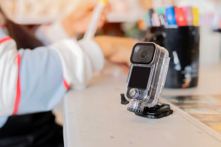 Side view shot of an small action camera install on art workshop table with blurred of woman sitting and doing craft work behind.