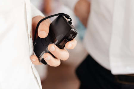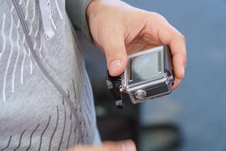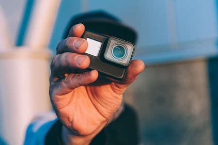photography equipment. modern electronics technology for active leisure and lifestyle. unrecognizable man holding action camera in hands.