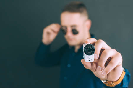 The guy takes photos, videos with an action camera, with one hand. on a black background in the studio