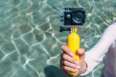 Close-up, action camera in a girls hand. Against the backdrop of clear water in the pool