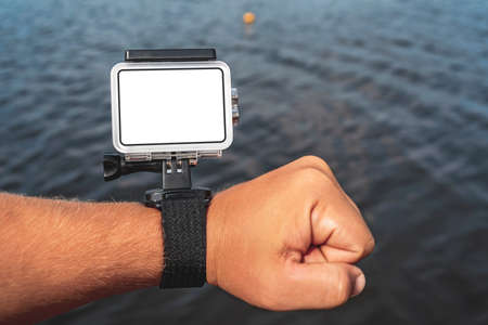 Close-up, mockup of a waterproof action camera with mounts on a man's hand. Against the backdrop of the blue water of the sea