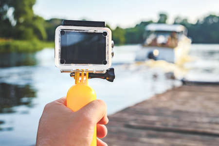 Action camera waterproof with a yellow float in a man's hand. In the background is a wooden pier with a speedboat on blue water