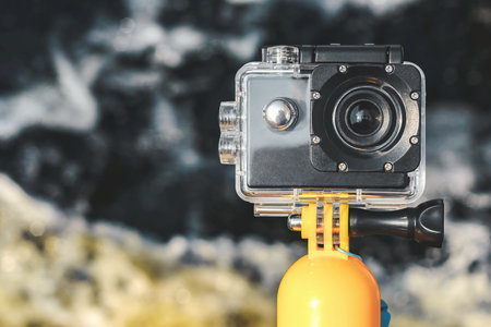 A very close-up of an action camera with a waterproof case and float for swimming against the background of water with waves in the bokeh