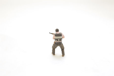 Toy soldiers with weapon and smoke on blue background, battle scene
