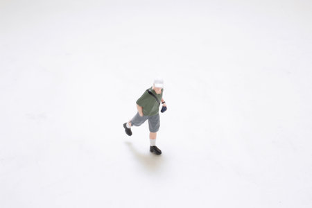 A small male figurine stands on a white surface, wearing a